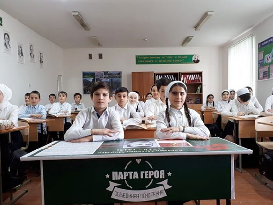 28.02.2020Патриотический проект под названием «Парта героя»Основная цель проекта – воспитать у подрастающего поколения уважительное отношение к истории нашего государства. Парта героя – ученическая парта с размещенной на ней информацией о заслуженном человеке, герое, вошедшем в историю отечества и/или являющимся героем нашего времени, его фотографией, биографией, героическим путем. В нашей школе представлена парта в память о Магомеде Мирзаеве-чеченец, участник Великой Отечественной войны, кавалерист, пулемётчик гвардии, старший сержант, Герой Советского союза.