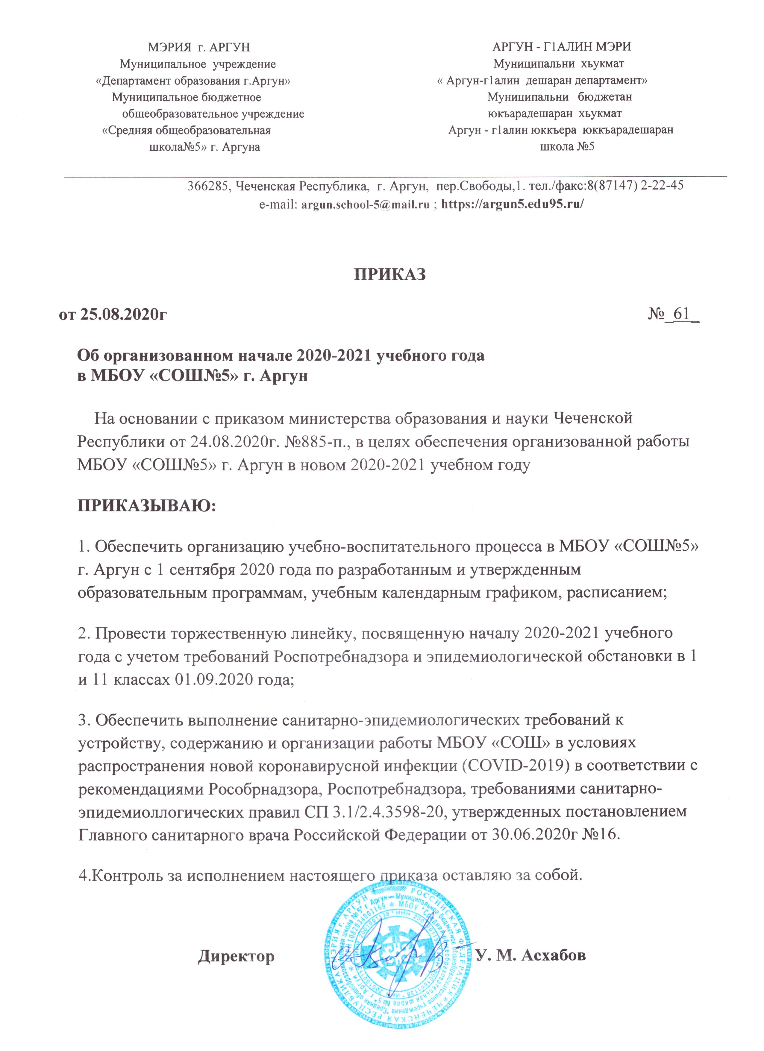 ПРИКАЗ от 25.08.2020г №61 Об организованном начале 2020-2021 учебного года в МБОУ «СОШ№5» г. Аргун