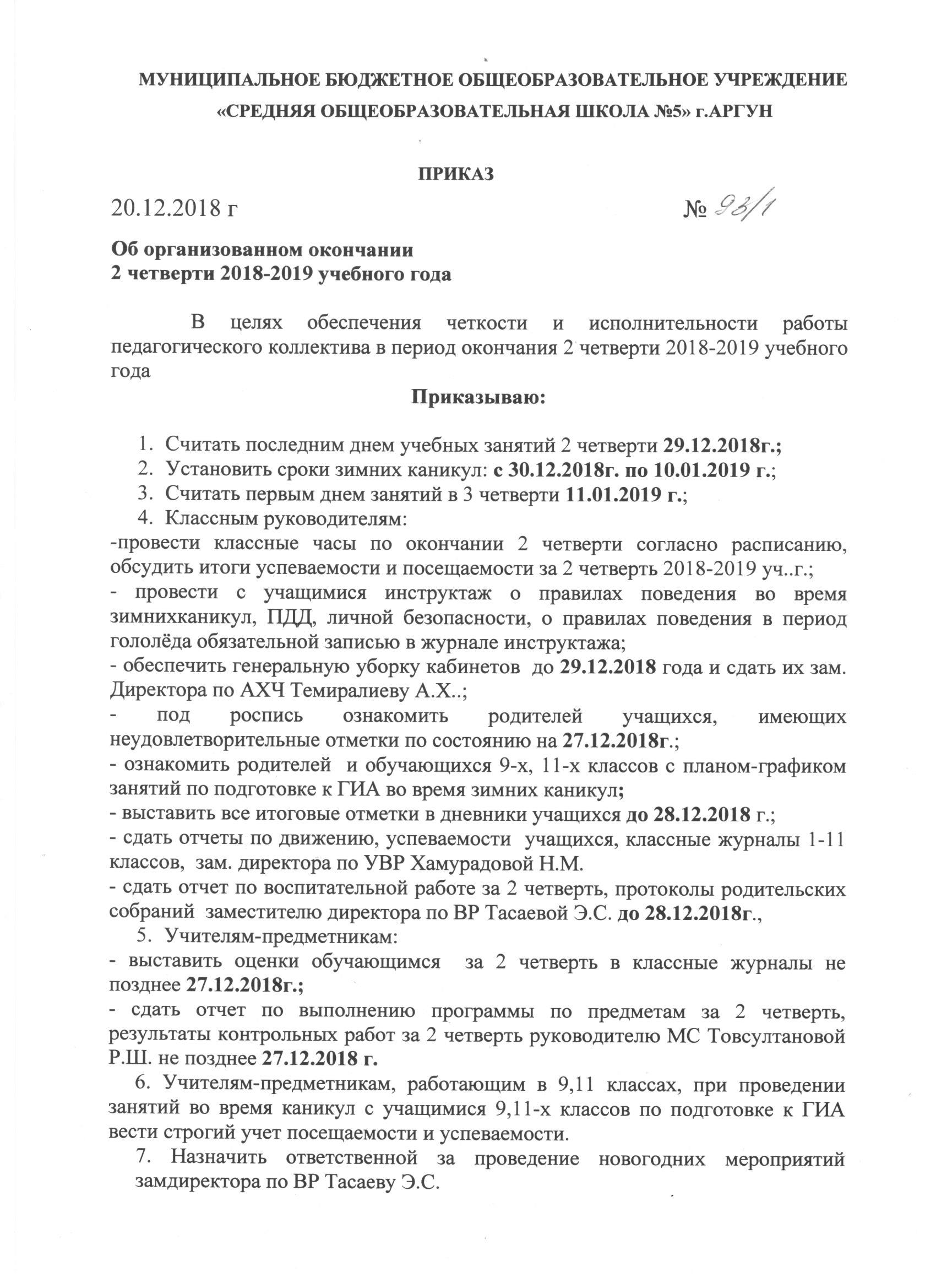 Приказ об организованном окончании 2 четверти 2018-2019 учебного года